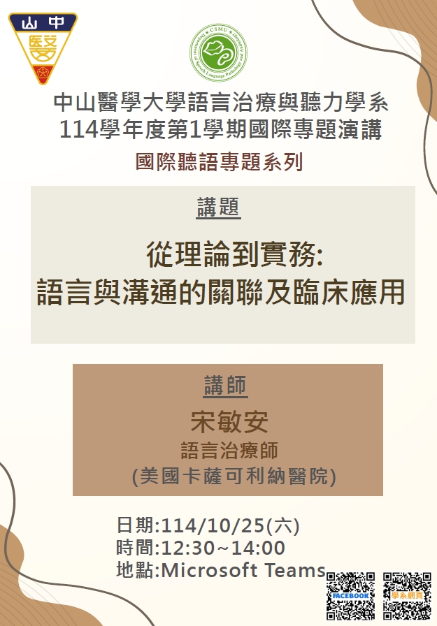 【中山醫學大學 語言治療與聽力學系演講】10/25 從理論到實務:語言與溝通的關聯及臨床應用